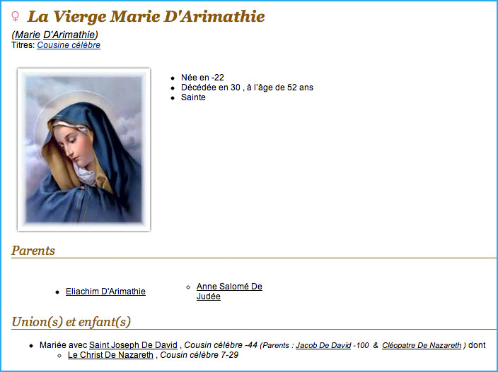 Concerning the mother of Jesus, it's frankly weird to find her designated as "the Virgin Mary of Arimathea". The inspired GeneaNet member who contributed this description was surely an adept of an obscure medieval English legend suggesting that Joseph of Arimathea was the paternal uncle of the Virgin Mary, and that he once visited the town of Glastonbury (Somerset) with his young nephew Jesus.